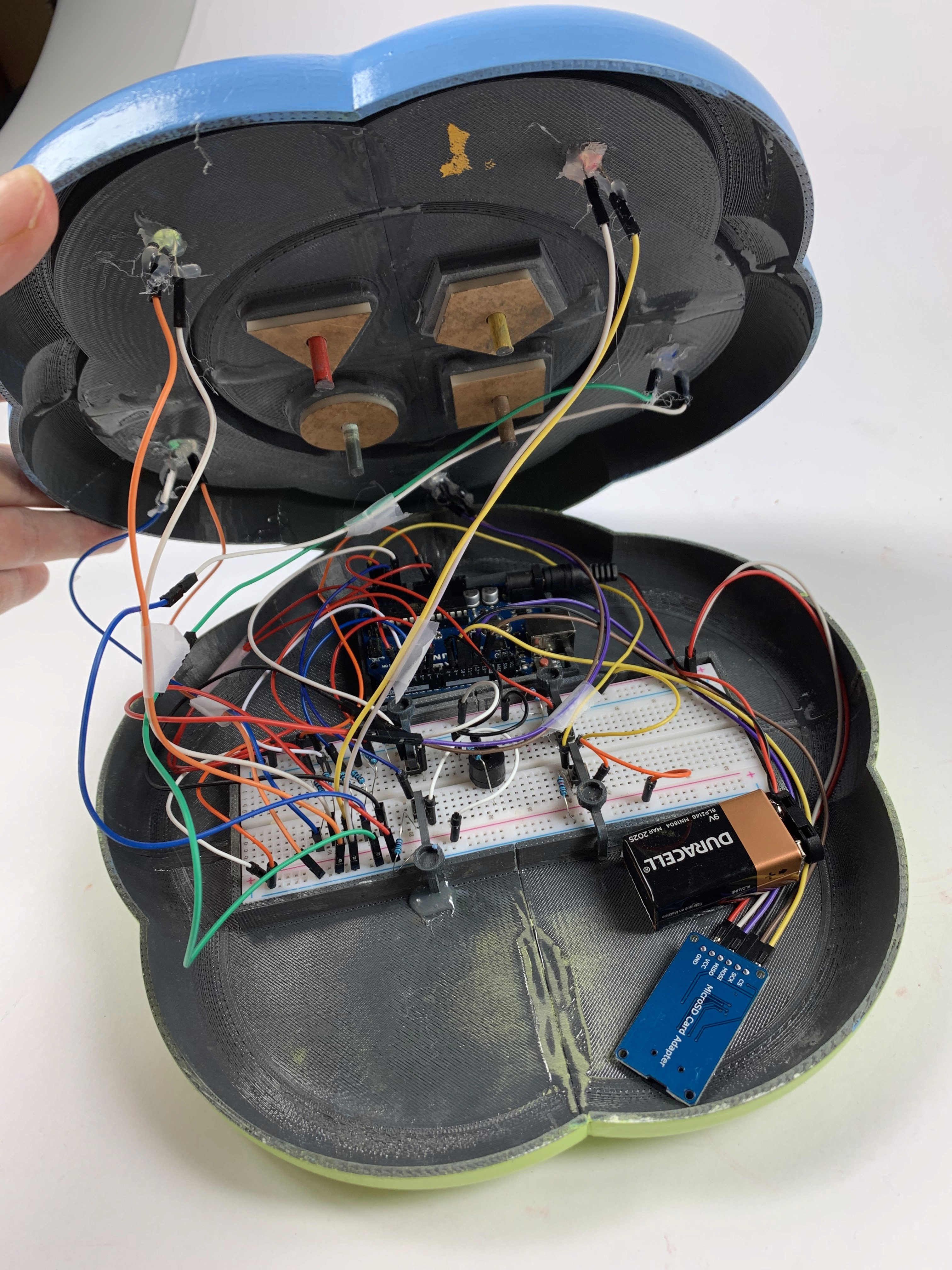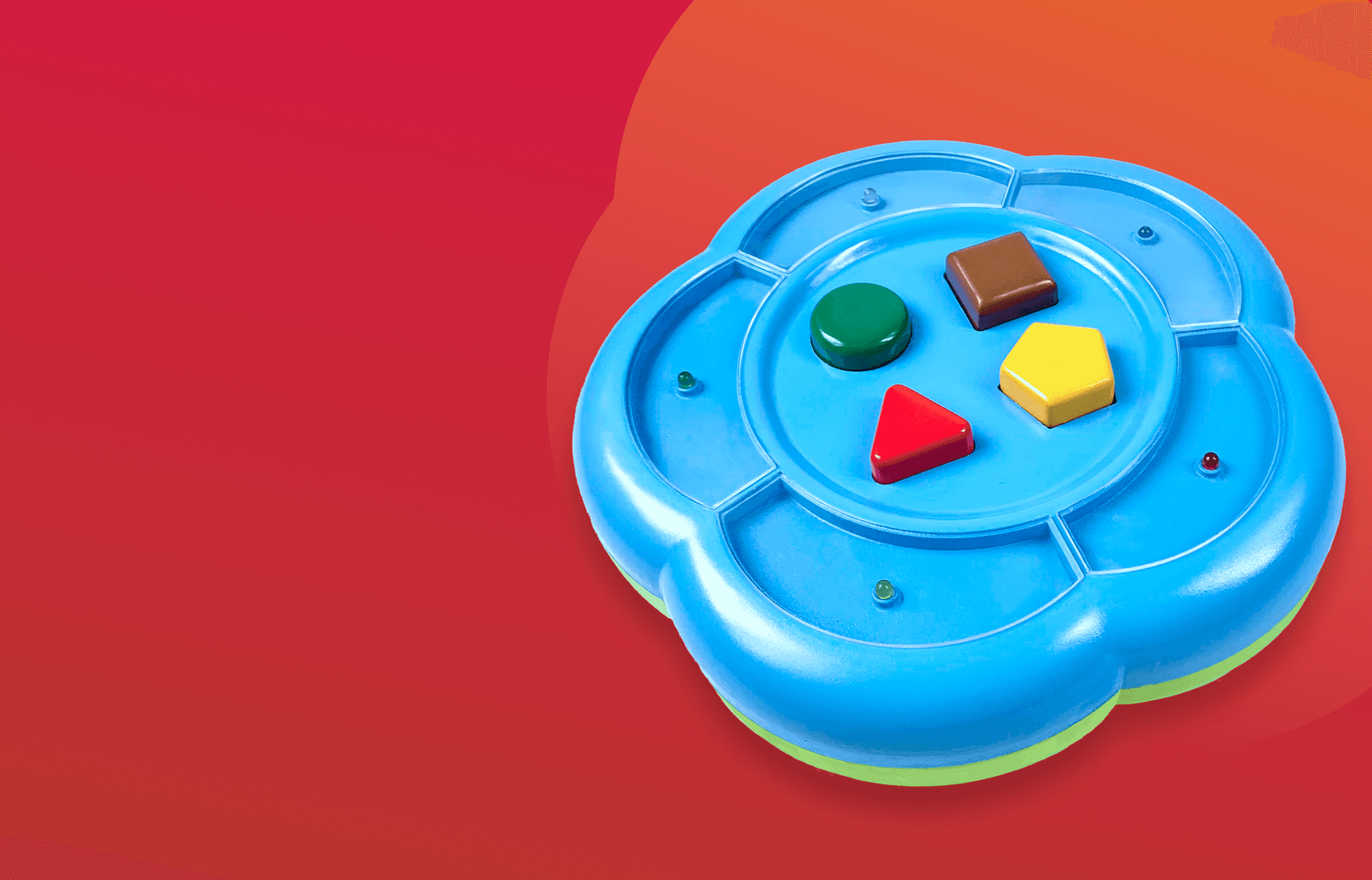 Children with ASD are expected to gravitate toward calming colors such as green and brown. These two buttons activate a gentle, repeating light pattern with no sound, because children on the spectrum tend to gravitate toward repetition and silence. In contrast, the red and yellow buttons activate randomized sounds and lights for a more stimulated experience.